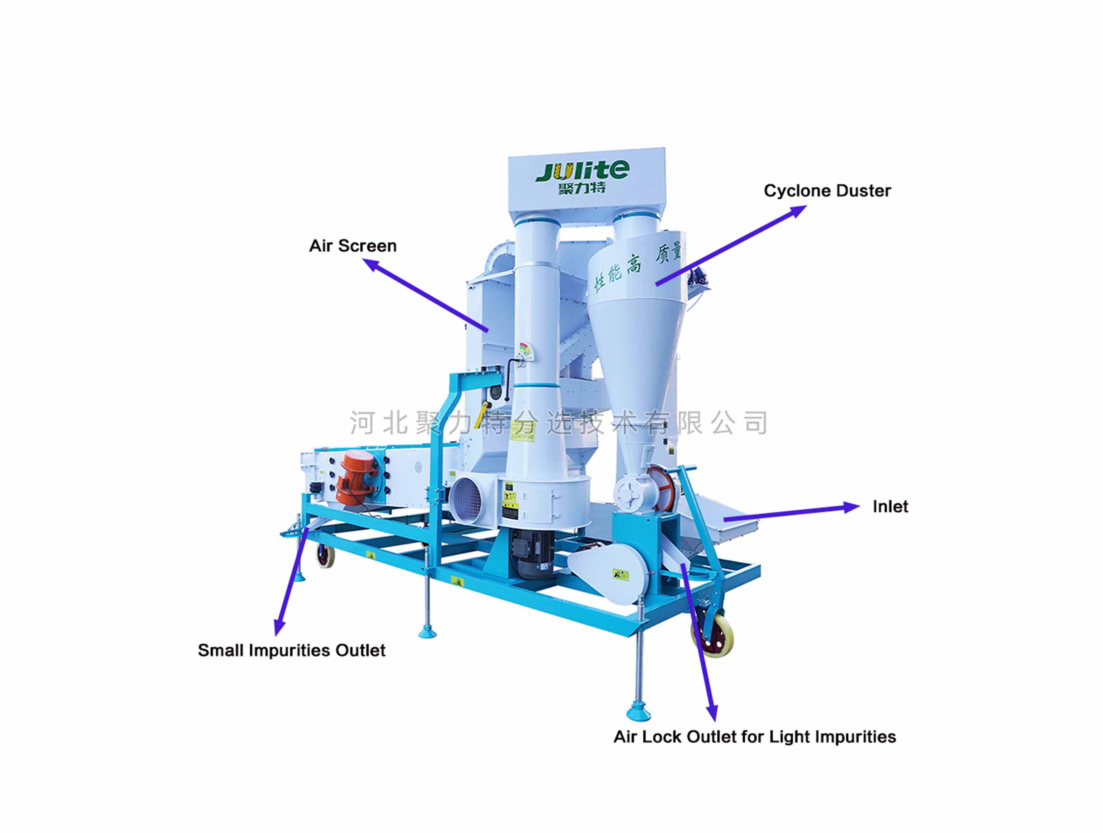 Puede limpiar impurezas ligeras a través de una pantalla de aire vertical y el zarandas de vibración puede limpiar impurezas grandes y pequeñas.